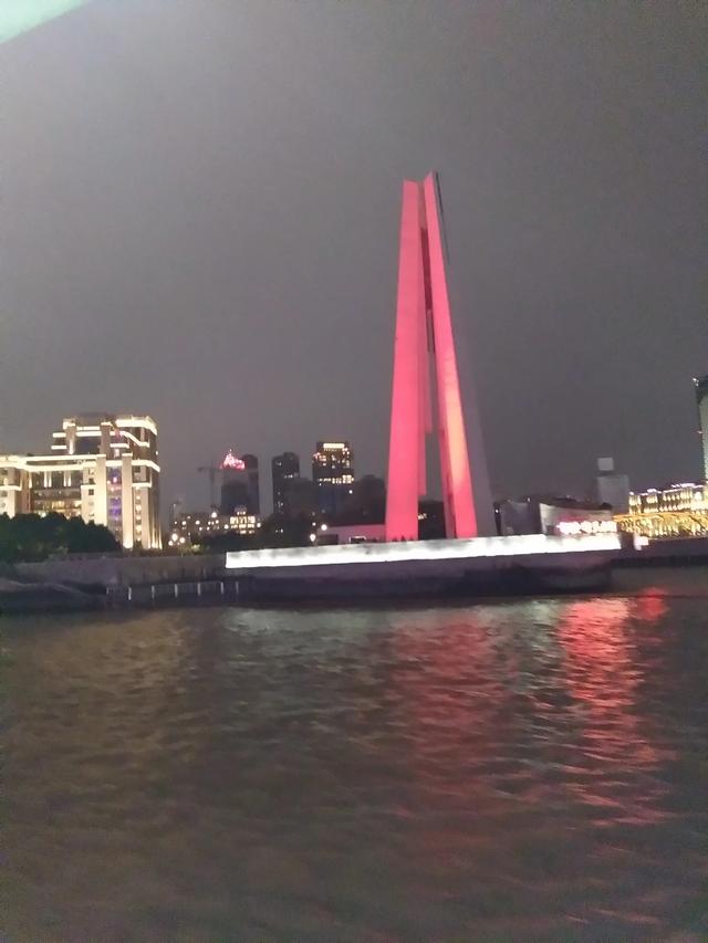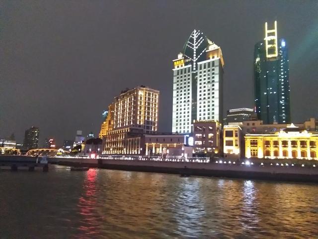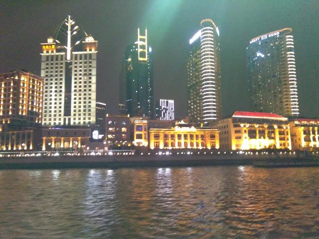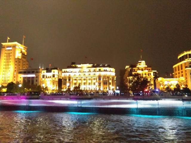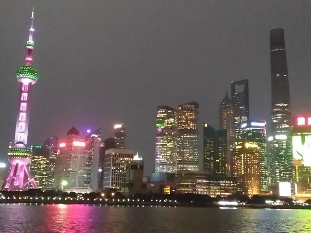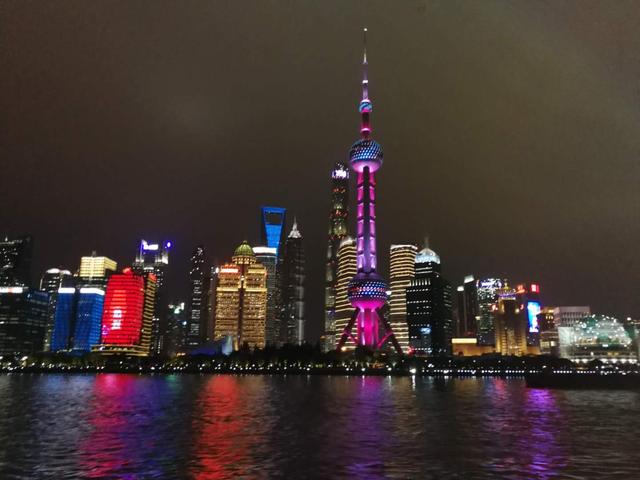坐在游轮上畅游黄浦江看到东方明珠和两岸五颜六色,灯火辉煌的夜景非常兴奋。