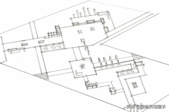 步骤一:先根据两点透视把平面图中的场地轮廓线、入口、道路、场地、水体等节点位置确定好,然后把一些立体的景观小品垂直方向立起来。
